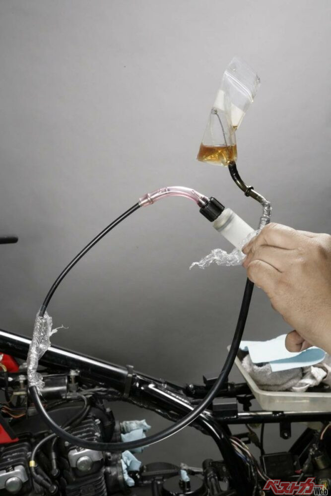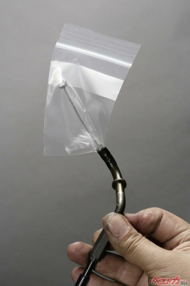 一方の重力落下式は、テープなどでケーブル端部に巻き付けたビニール袋にグリスや潤滑油を溜めて、重力を利用して注入します。この方法では入り口と出口に高低差をつけるため車体からケーブルを取り外して行うのが一般的で、スプレーに比べて時間も掛かりますが、ケーブル金具の形状によってインジェクターがフィットしない場合には有効です。