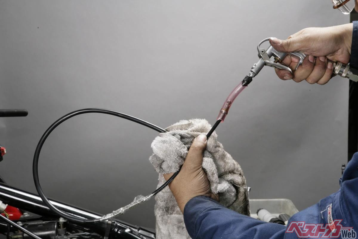 ケーブル内に注入したグリスや潤滑油はフリクションロス低減に役立ちますが、余分な油分が徐々に流れ出してキャブレターやエンジン、ブレーキ周りに付着すると汚れやトラブルの原因にもなりかねません。
