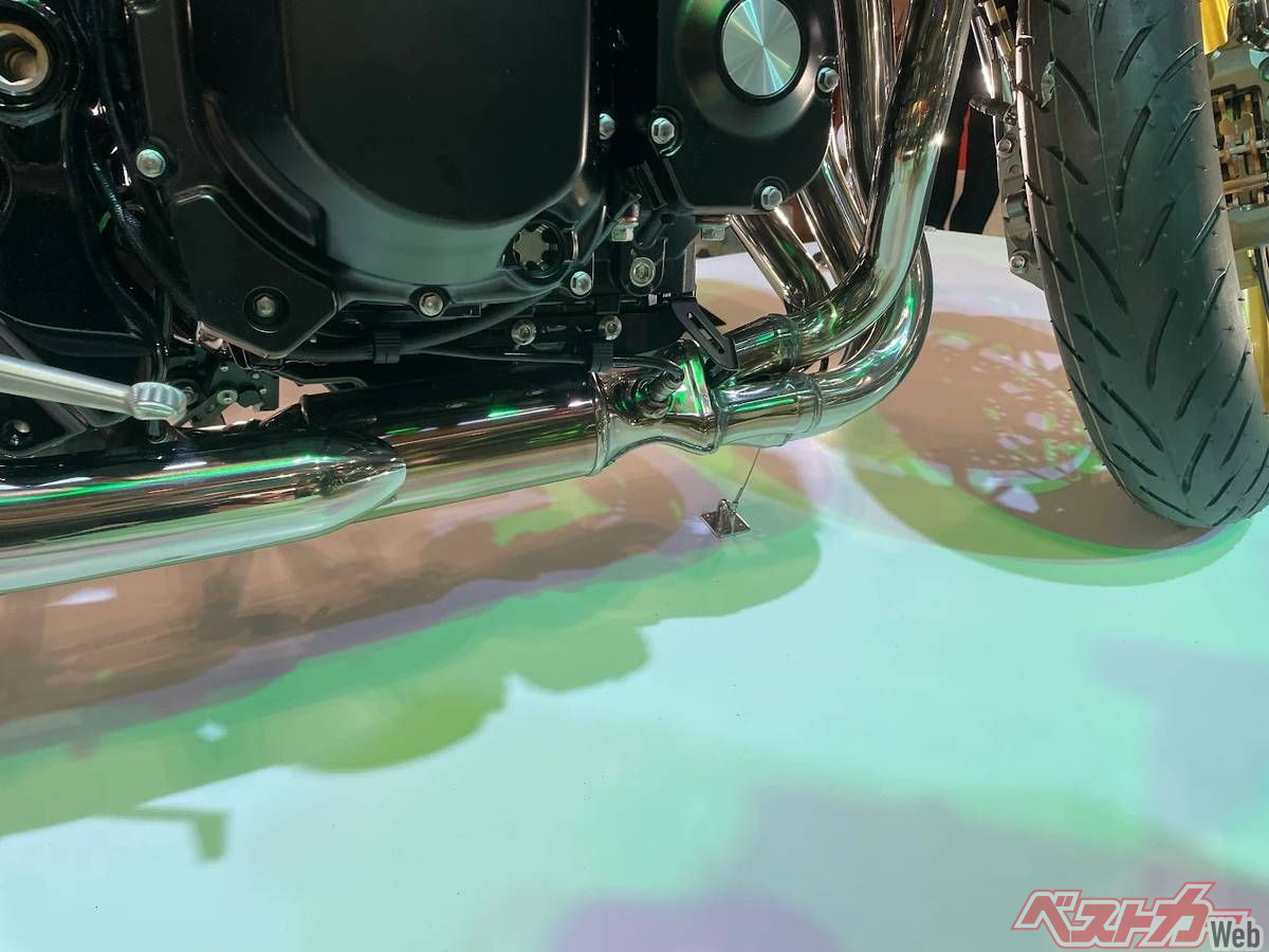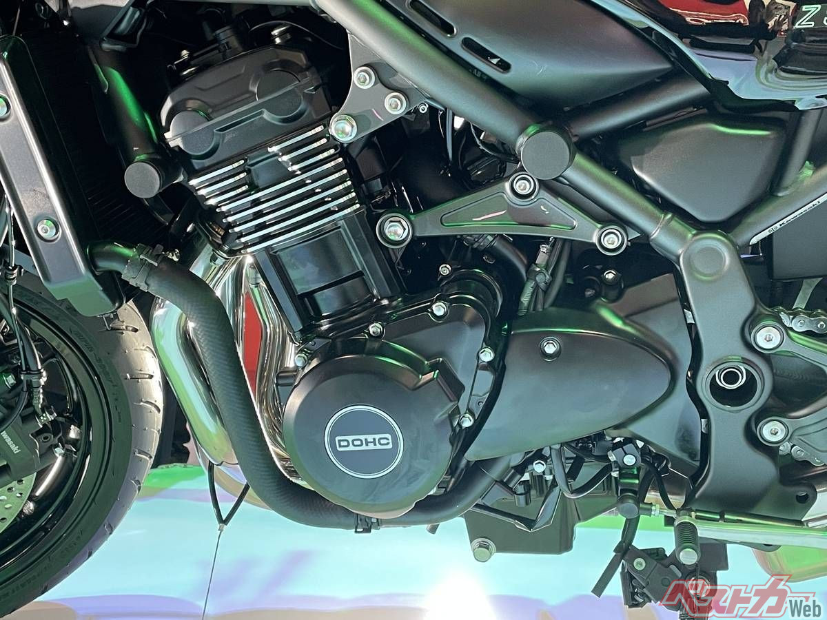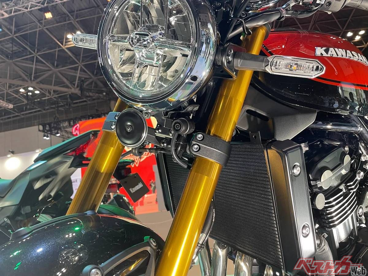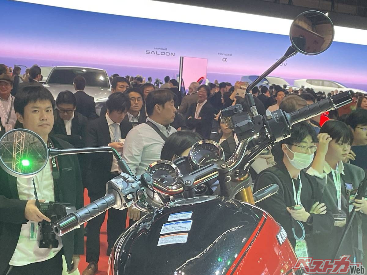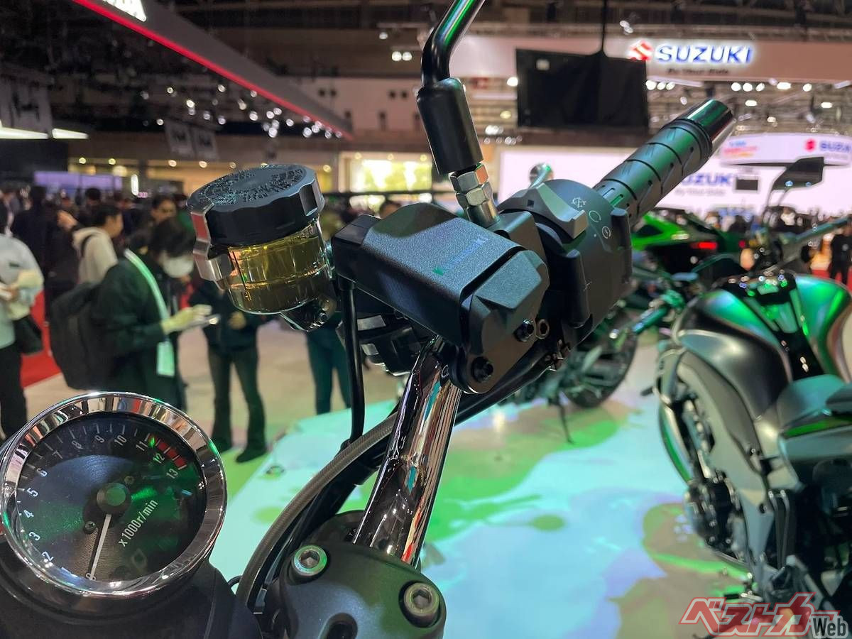 今回のモビリティーショーでカワサキが出展するバイクのうち、明らかになっていなかった2つの「世界初公開」モデルが同時公開された。事前に予想されていた通り、登場したのはアップデートを遂げた新型「Z900RS」だった! 見た目はほぼ従来通りながら、電子スロットル、クルーズコントロール、IMU、スマホ接続といった電制周りを強化し、人気モデルとしての戦闘力を高めた。先んじて更新された「Z900」同様に、クイックシフターも備えている。