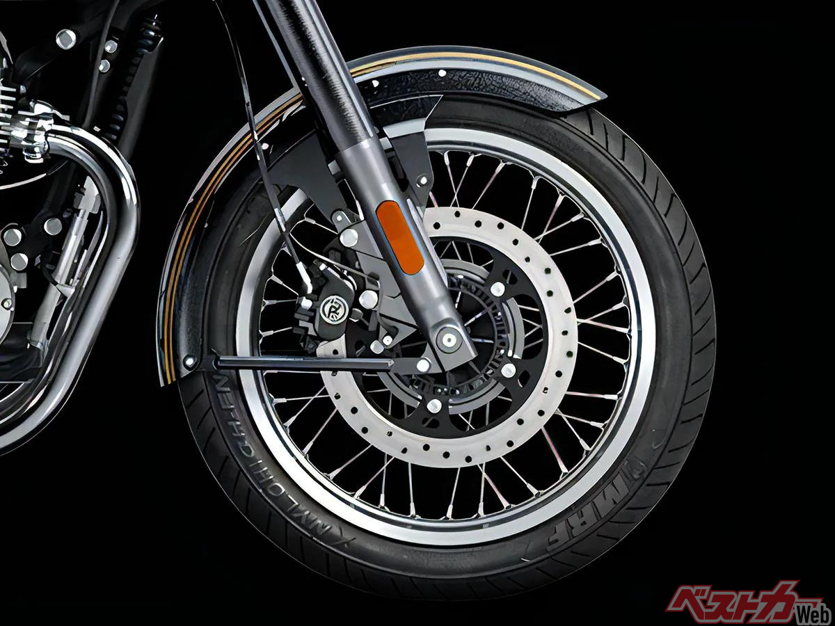 サスペンションは前後ショーワ製で、フロントは41mm径の正立タイプフロントフォーク、リアはツインショックを採用。ホイールサイズはフロント19インチ、リア18インチで、ブレーキは前後ディスクタイプが装着される。