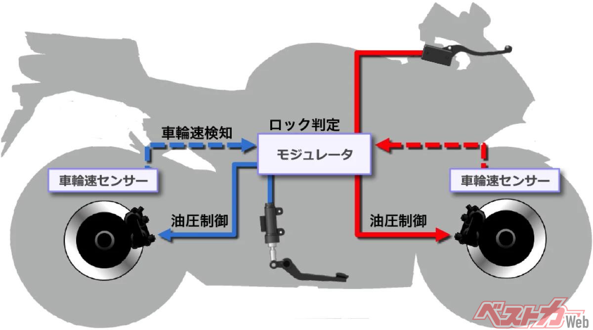 今ではほとんどの新型バイクに標準装備されているABS。強いブレーキ操作などの際に、タイヤがロックして滑るのを防ぐ安全装置で、法律で装着が義務化されているのですが、どんな経緯があるのでしょうか? また、近年、似たようなシステムにCBSというのもありますが、ABSとどう違うのでしょう? さらに、2025年から導入された新基準原付の場合はどうなるのかなど、ABSのイロハについて紹介します。
