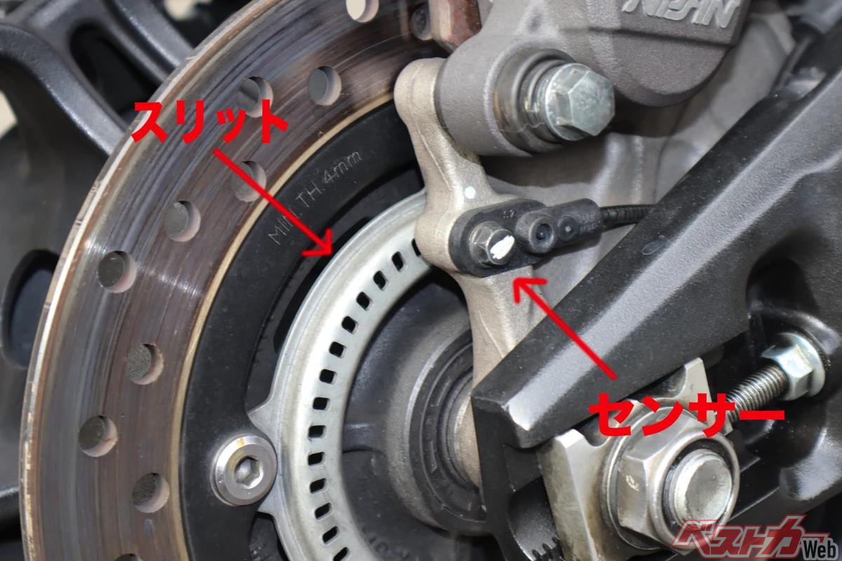 なお、ABSには、ホイールのスピードを読み取るセンサーを使いますが、一般的なバイクであれば、ブレーキディスクの中心付近に設置してあります。円盤状のスリット入りパーツと、そのスリットを利用しホイールスピードを検知するセンサーが付いていることが多いですね。そして、これらを見れば、そのバイクがABS付きかどうかが分かるというワケです。