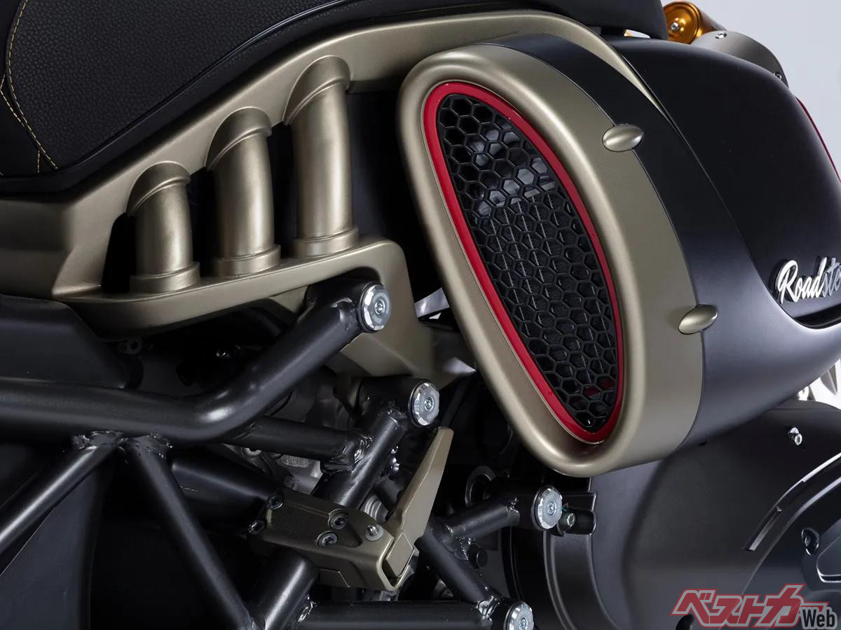 「Roadster 400」のデザインは戦闘機からインスピレーションを得ながら、過去の古典的なシルエットをオマージュ。 タービンインテークを彷彿とさせる特徴的なサイドパネルは単なるデザインではなく、サイドマウントされたツインラジエーターに空気を送り込む機能的な冷却ダクトとなっている。
