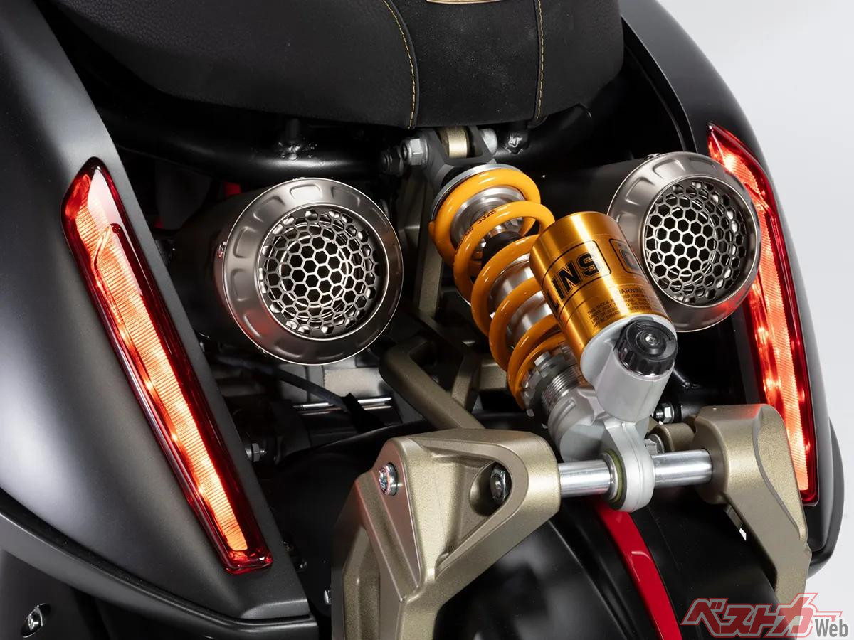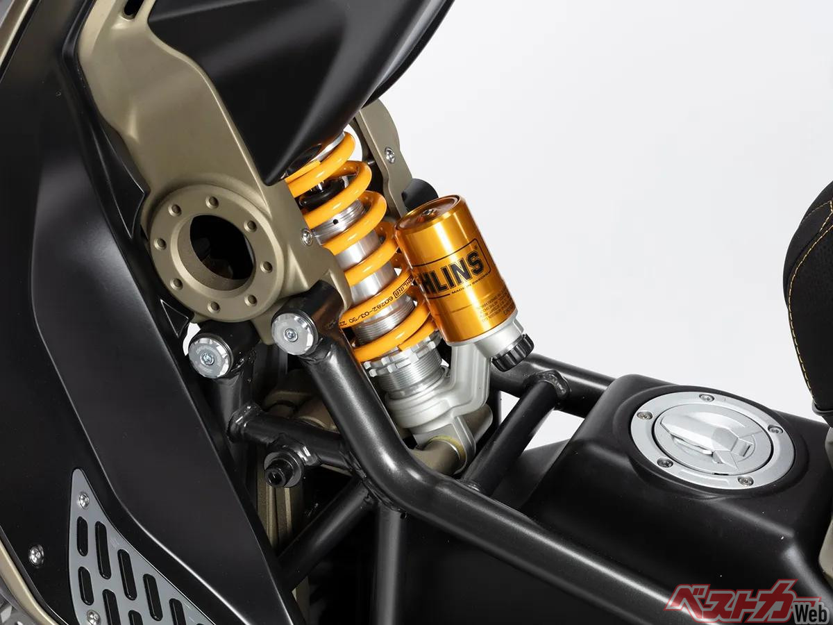 リアのショックユニットもオーリンズ製で、大きなリンクを介してサイレンサーの間に取り付けられている。