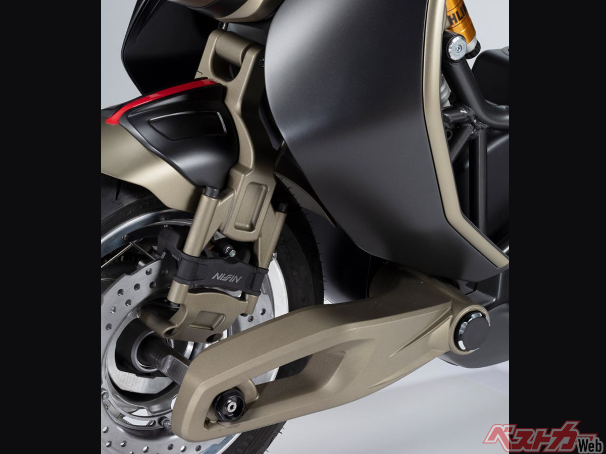 ホイールはビレットスポークタイプが装着され、ニッシン製のブレーキキャリパーはステアリング機構に挟み込むという、極めて個性的な方法でマウント。ショックユニットはオーリンズ製のモノタイプで、足の間に挟まれるようにセットされている。
