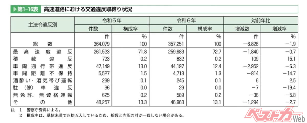 たとえば、内閣府が公開している「令和7年版交通安全白書」によると、2024年に高速道路において違反行為で検挙された件数のトップ3は以下の通り。
