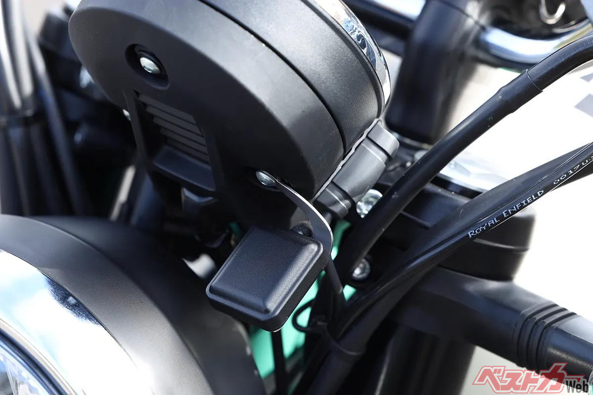スタンドを立てた際、少し車体が寝る角度が強いベア650。伊藤さんは独自のカマセをタイラップで固定。