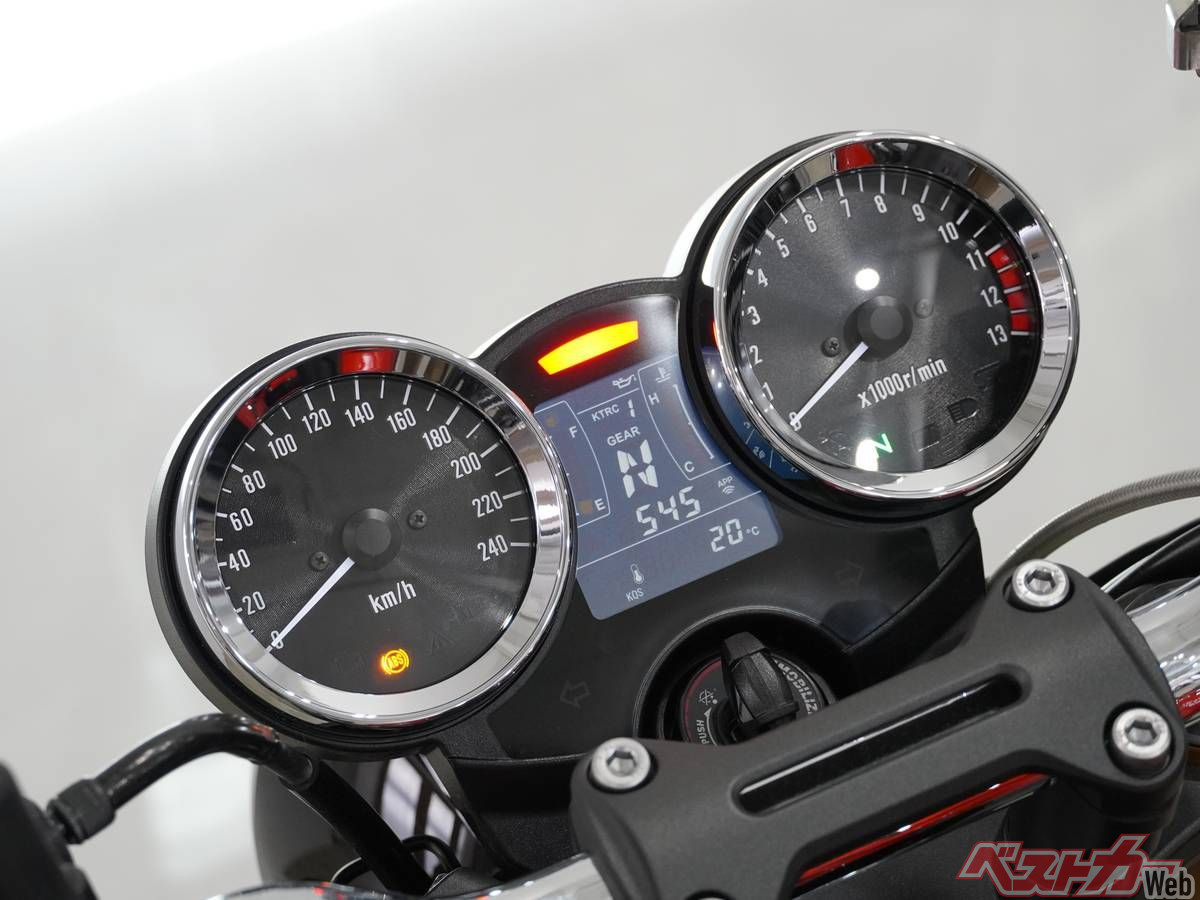 また先にお伝えした通り、ハンドル位置やシート高が見直されたことで、ライダーのポジションはよりコンパクトに変化。またライダー支援システムとして、新たに6軸IMUによるKCMF(カワサキコーナリングマネジメントファンクション)パッケージの採用によりトラクションコントロールが高度化。コーナリング時のブレーキングや急激な路面変化、悪路面に対応する安定した減速を可能とするABSの高度な制御も備えた。スマホ連携機能も新装備し、「RIDELOGY THE APP MOTORCYCLE」アプリとの接続によって残燃料、オドメーター、メンテスケジュールなどの車両情報をスマホで確認できるライディングログ記録、着信通知、ナビ機能の表示、音声コマンド機能も搭載。それでいて従来からの、砲弾型アナログ2眼メーターとミニサイズの液晶モニタ、というコクピットレイアウトは引き継いでいる。