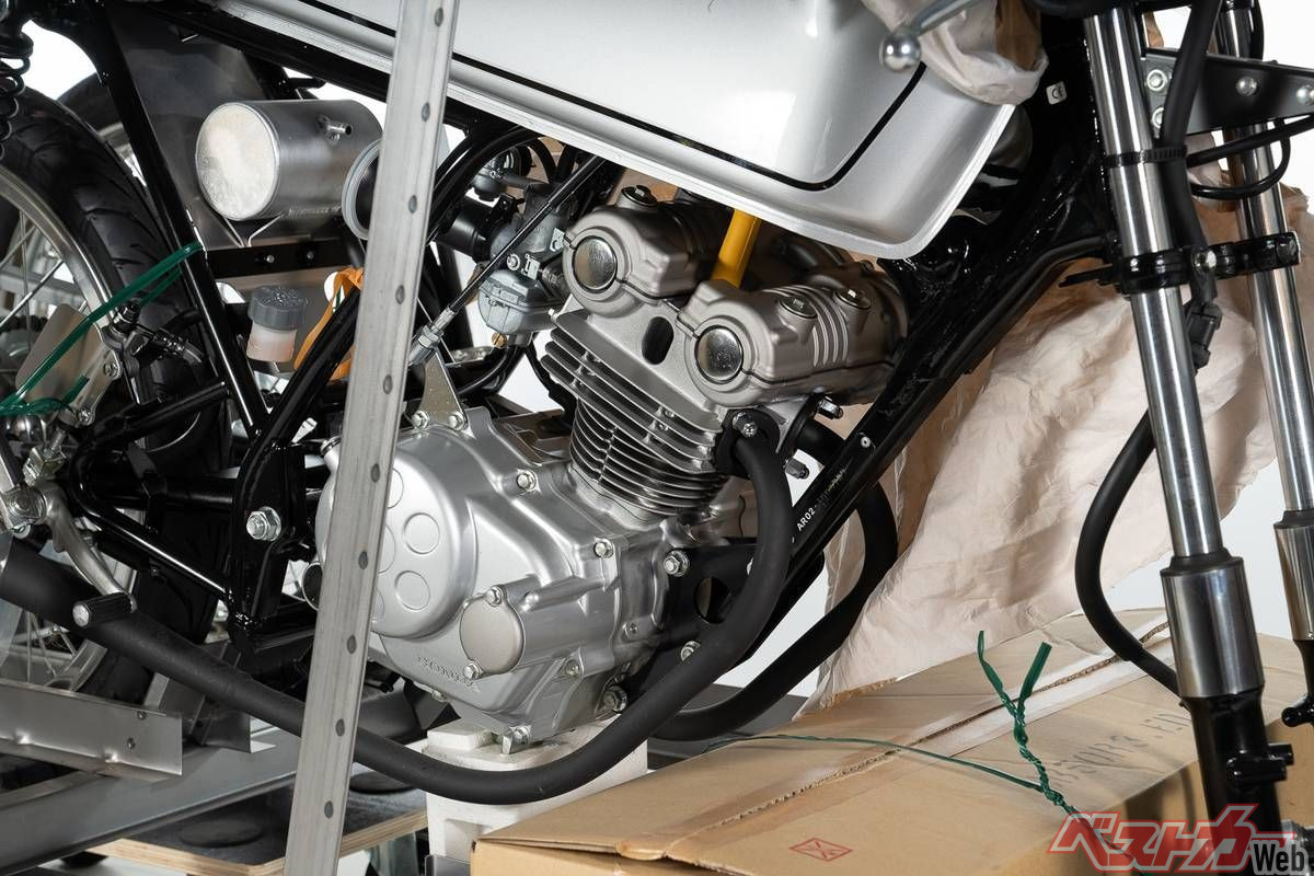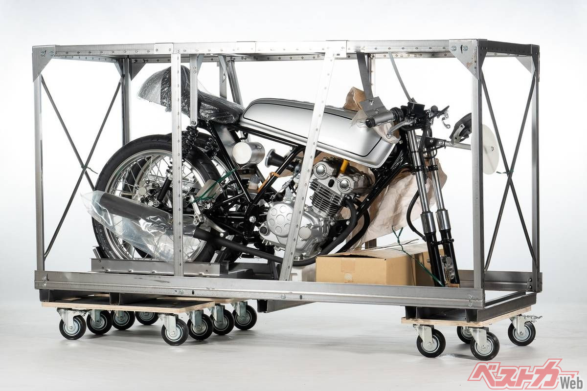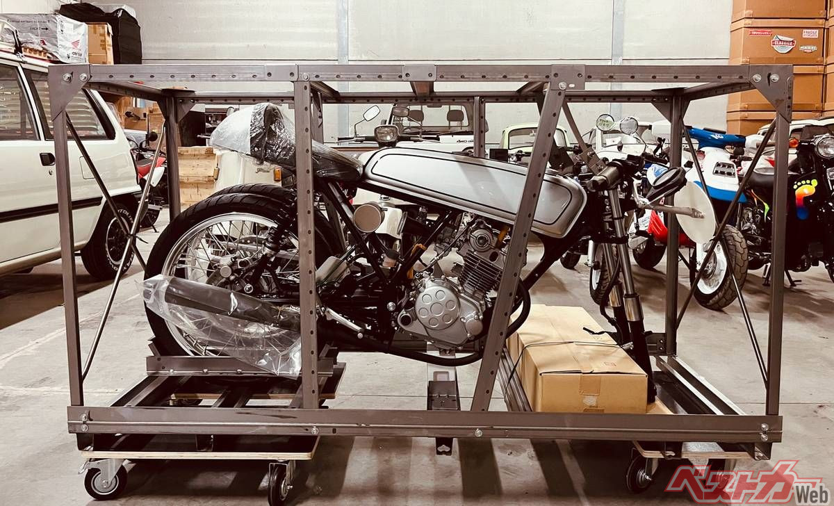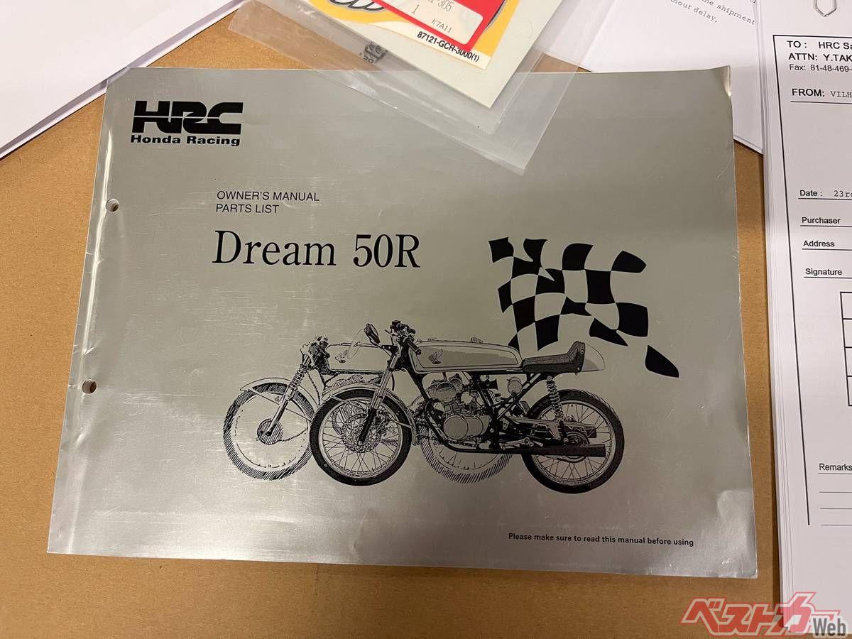 そんなドリーム50Rは販売台数も少ないことから、ただでさえレアリティが高まってきたドリーム50以上に発見することすら難しい珍品となっており、マニア垂涎の一品だ。オークションに出品されることももちろん珍しいのだが、輸送用のアルミフレームに入ったままのミントコンディションの新車、となると、おそらく最後の存在といえるだろう。保管状況も良好であった様子で、車体各所には錆ひとつなく新品そのまま。もちろん当時のステッカーやサービスマニュアルも付属し、20年の月日を感じさせない存在感だ。