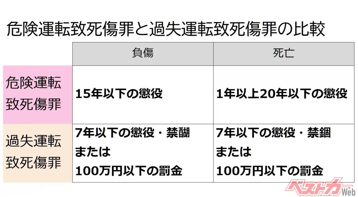 危険運転は「意図的に危険な状態で運転し人を死傷させた」とされ悪質性が高いため、懲役刑のみで刑期も大幅に重い。一方、過失運転は「不注意(過失)で人を死傷させた」罪で、懲役・禁錮のほか罰金刑もあり、刑罰が軽めになる。