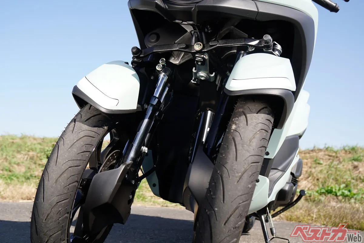 従来の二輪車ユーザーにとって「トリシティ125」の直進性と旋回性の両立は、マシンコントロール性のよさとして感じられるだろう。車体の倒し込みやすさと前二輪のグリップ力は通常のバイク以上で、コーナリング中の車体の安定性もハッキリと感じられる。左右への車体の切り返しも軽快に行なえるので、コーナリングする楽しさを存分に味わえるからだ。