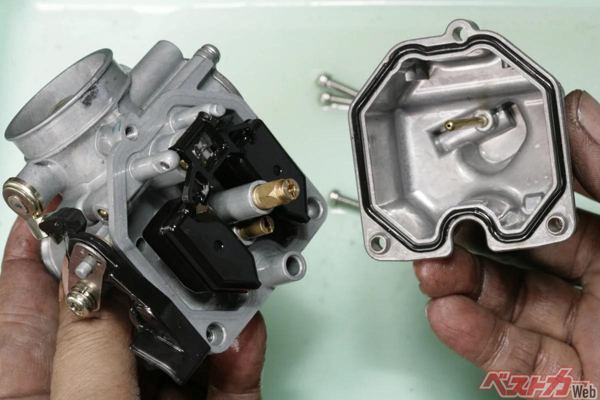 具体的にはフロートチャンバー内の油面が低いと混合比は薄く、反対に油面が高いと混合比は濃くなります。フロートチャンバー内のガソリンは、ベンチュリーを通過する空気=エンジンが吸う空気の負圧と流量に応じて吸い上げられます。