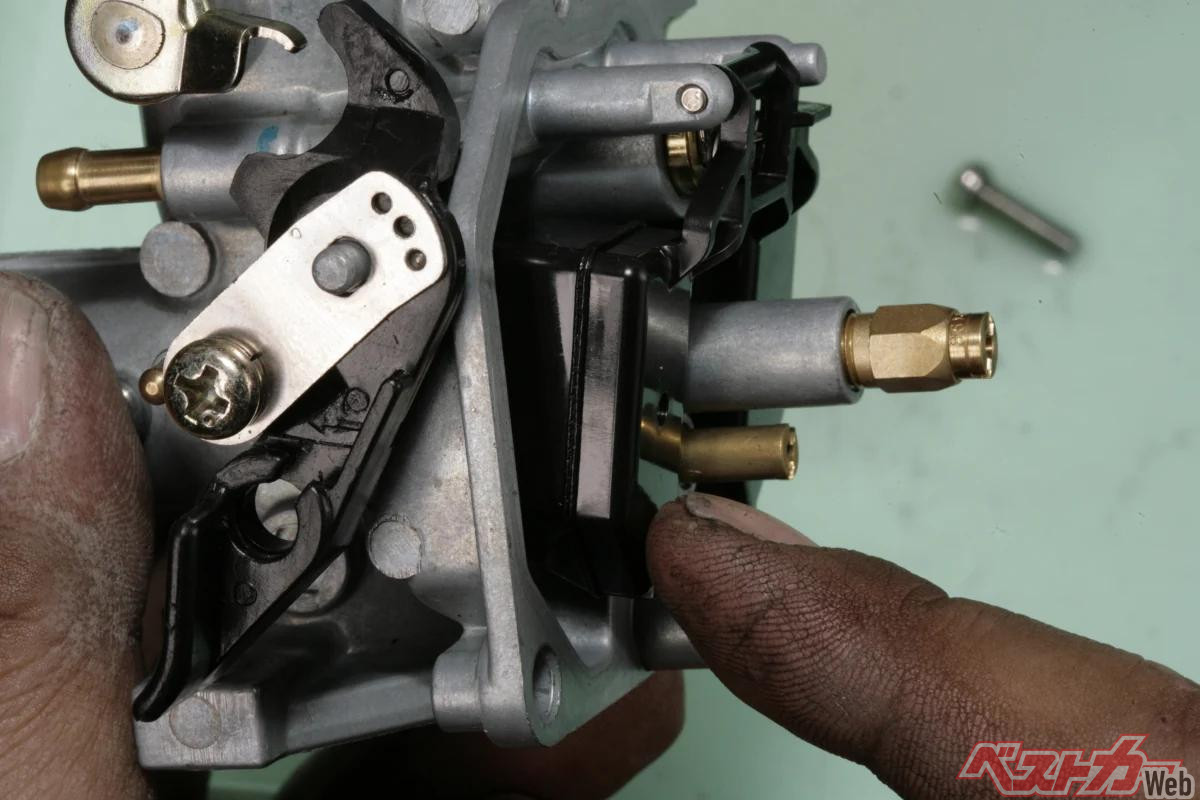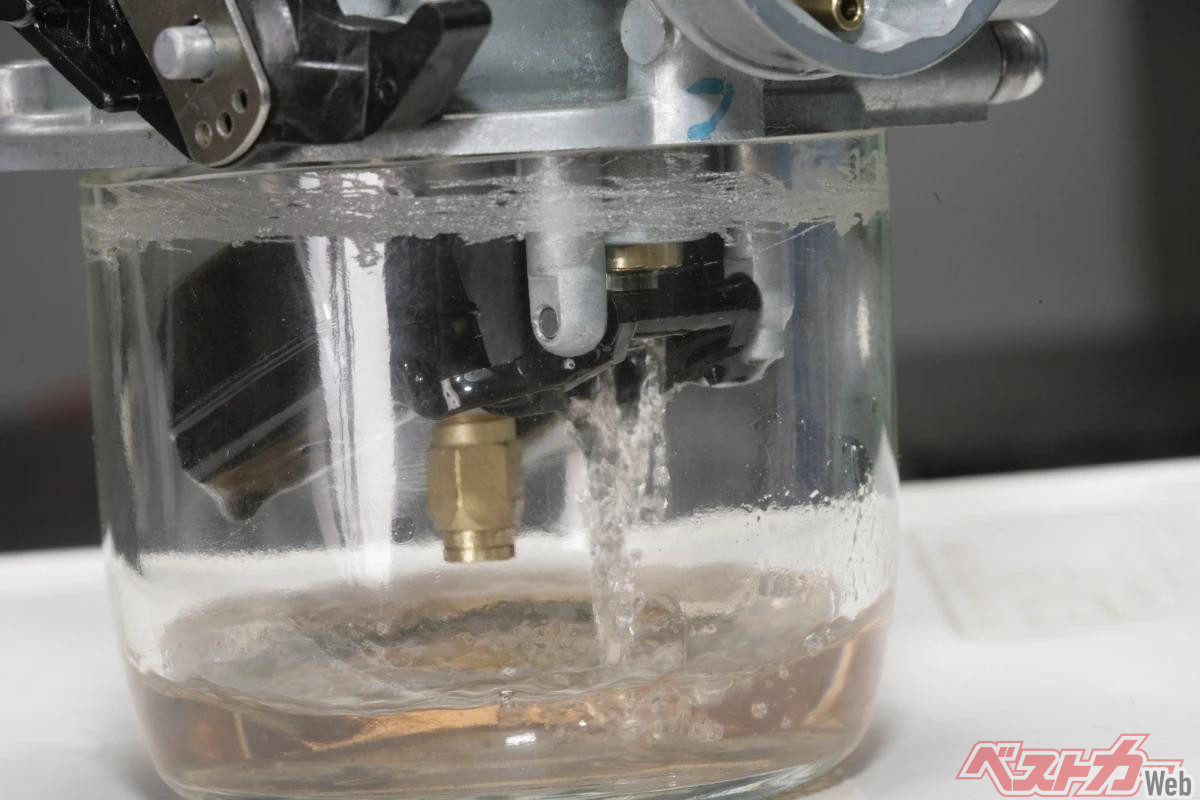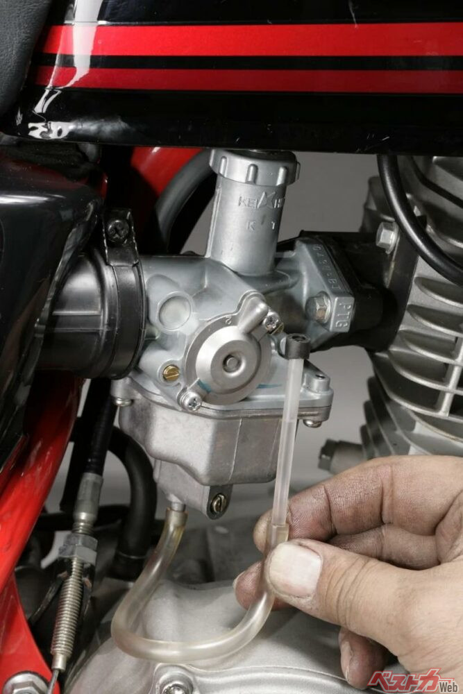 フロートチャンバー下部のスクリューを緩めるとガソリンが排出できるドレンパイプ付きキャブレターは、パイプに適当なチューブを差し込んでスクリューを緩めるとフロート内と同じ高さまでガソリンが上昇して実油面を測定できる。