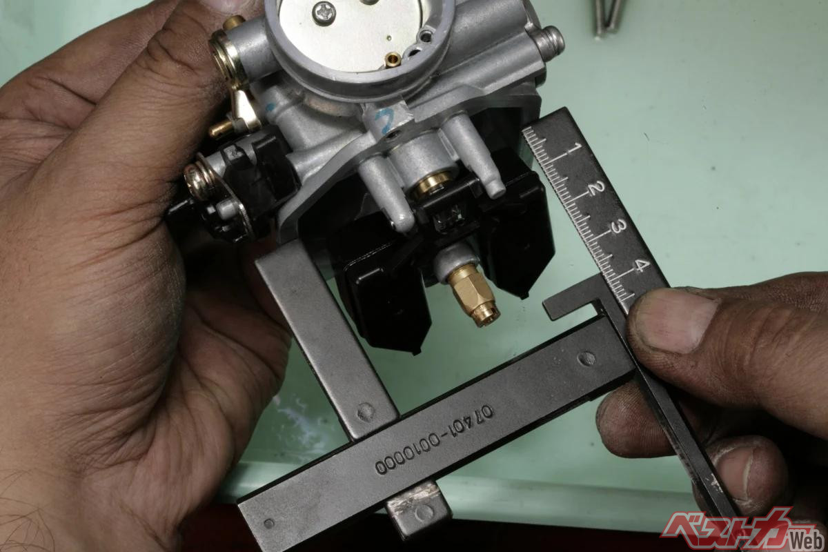 専用工具のフロートレベルゲージはキャブボディの下面に2本の足を載せて、フロート下面までの高さを測定する。ノギスのデプスゲージでも測定できるが一点支持となりノギス自体が傾きやすいため、二点支持のフロートレベルゲージの方が取り扱いが容易。