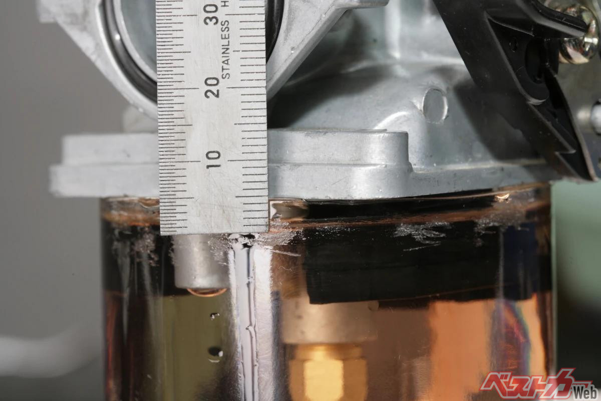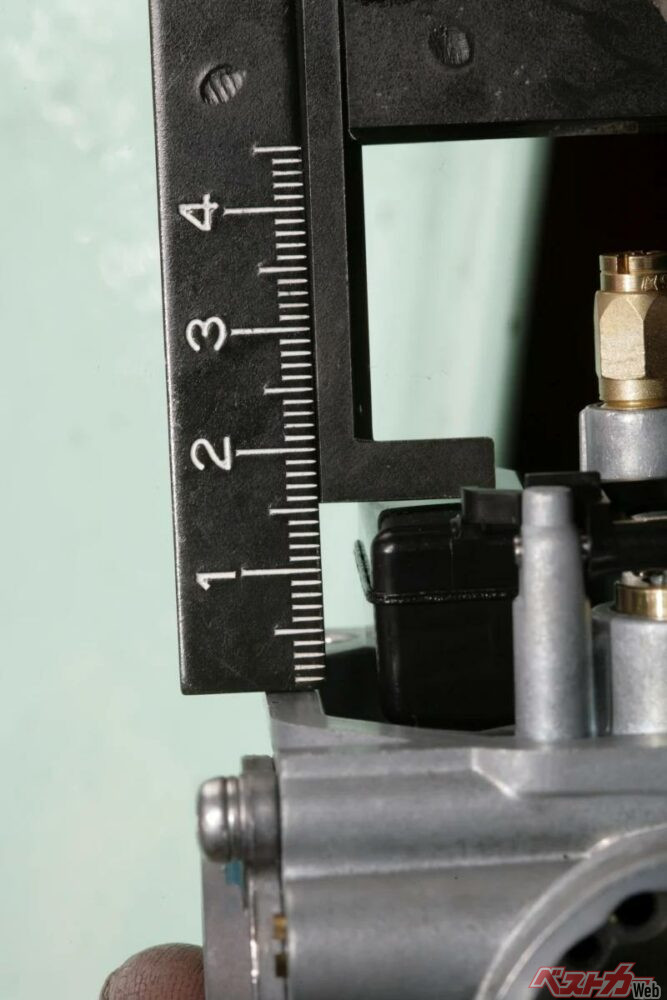 キャブレター本体とフロートチャンバーの「合わせ面から◎(下)~△(上)mm」というデータが出ている場合、目盛り付きのフューエルレベルゲージで確認した油面を元に調整できる。標準値より測定油面が低ければフロートが現状より上がった位置でバルブが閉じるよう調整板を曲げ直す。