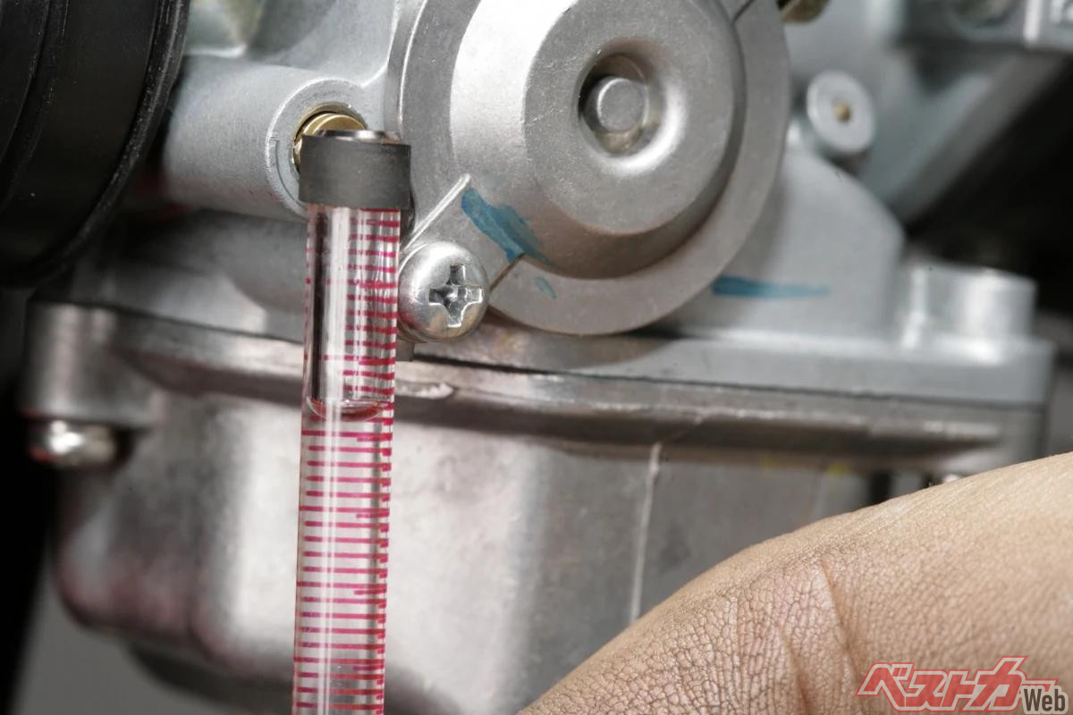 フロート高さの測定値を油面に置き換える方法に対して、フロートチャンバーにドレンパイプが設置されているキャブレターであれば、パイプ式のゲージでフロートチャンバー内の油面を確認するやり方もあります。