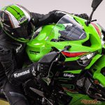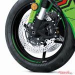 足まわりはブレーキディスクを真円タイプに変更。従来は前後ともペータルディスクだったが、ZX-10Rのイメージを反映した。ディスク外径は前φ310mm、後φ220mmと変わらず。ラジアルマウントモノブロックキャリパーとラジアルポンプマスターシリンダーも従来型を踏襲する。