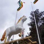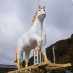 近くには白いテントが組まれていた。中にはこれまで作られたジャンボ干支の写真が掲示されていて、現在地の表記もされていた。現在奉納されている白馬、午もそうなのだが、奉納の期間が終わった後は希望者に渡されることになっていて、周辺地域ではかつて奉納されたジャンボ干支を巡ることも可能だ。