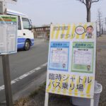 お昼になると来場者がさらに増え会場は混雑した。ハイキングのイベントで駅から歩いてきた来場者もいたようだ。筆者はシャトルバスの発着場を見てみた。通常は松阪市三雲地区のコミュニティバス「たけちゃんハートバス」のバス停があるが、シャトルバスも停車するようになっていた。