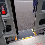 今回は特別に車いすユーザーの乗降対応を教えてもらった。運転席にあるスロープボタンを押すのだが、写真のようにドアは「半開き」になり、スロープの展開中は乗降ができない工夫がされている。