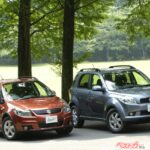 2006年登場SX4(左)。翌年、SX4はセダンがラインナップに。奇しくもその年に軽自動車年間販売台数トップをダイハツに渡す。写真右側はダイハツ ヴィーゴ