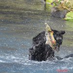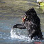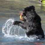ヒグマは泳ぎの名手です。力尽きた鮭だけでなく、まだ上流に向おうとする鮭を潜水して巧みに捕まえます。頭とエラに嚙みついてグルングルンと振り回し、息の根を止めます。