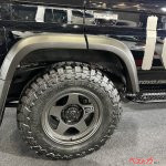 現行型にもピタリと合うという。足をかける場所には、手製の滑り止めが付いていて、細かな職人魂を感じる部分だ。ルーフキャリアやサイドステップを取り付け、タイヤはトーヨーのオープンカントリーM/Tに変更。