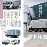 清涼飲料水やアルコール飲料を運搬・配送する「ボトルカー」は、さまざまな場所で頻繁に見かける特装車です。そのドライバーが飲料品ケースを降ろしたり、空きボトルが詰まった袋を積み込んでいる姿からも、ボトルカーの機能はわかりやすいですが、このボトルカーは驚くほど多種多様で、意外な歴史の持ち主なのでした。ボトルカーの機能や構造、製造工場のレポートに意外な歴史、そして三菱ふそうeキャンターのボトルカーの試乗に至るまで、全14ページにおよぶ大特集となりました。