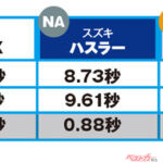 同様の理由により、2名乗車時と4名乗車時のタイム差も、N-BOXは0.85秒だからハスラーよりも若干少ない。2名乗車時と4名乗車時で、最もタイム差が大きく開いたのは、実用回転域の駆動力が弱いハスラーだった。