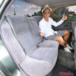 サイズの恩恵を受けたのがリアシートで、大人が乗ると頭が天井にぶつかるカリーナEDに比べて余裕。身長176cmの小沢が前席に座ったポジションで、リアでヒザ前が余り、頭上スペースも広い。