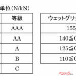 転がり抵抗性能とウェットグリップ性能、どちらか片方がこの等級から外れても低燃費タイヤとよぶことはできず、グレーディングシステム(等級制度)に基づいて、「転がり抵抗性能」と「ウェットグリップ性能」の等級分けをラベル表示するように業界自主基準を設けています。