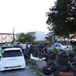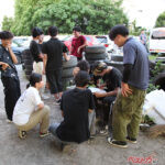 京大自動車部のガレージはメインキャンパスである吉田キャンパス構内にあります。2024年8月某日の金曜日、指定された住所に向かうと、西部講堂と呼ばれる建物の隣にガレージを発見。屋根付きピットと未舗装の駐車場が専有エリアになっており、多くの部員が集まっています。