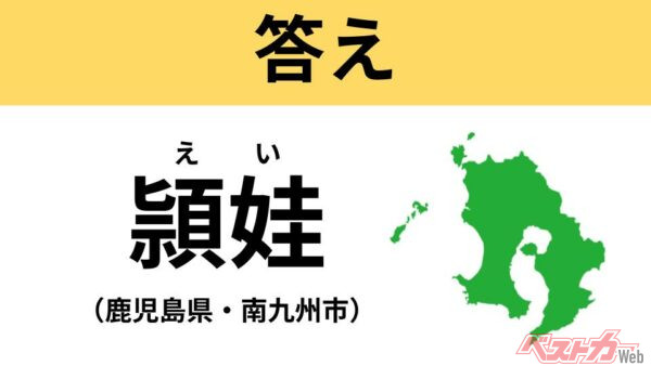 今回は初見殺しの難読地名が多数存在する鹿児島県からの出題です。頴娃と書いて「えい」と読むのが正解。最初の1文字「頴」で「えい」と読み、「娃」の字は発音しません。
