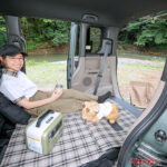 後席を格納して荷室を広げた時は、荷室の床面を水平に近づけ、座った時に硬さを感じないように配慮した。広げた荷室がチェック柄のカーペットを敷いた小部屋風になってリラックスできる。