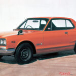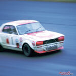 オフホワイトのボディに赤いレーシングアクセント。リベット留め風オーバーフェンダーや、フロントマスクのバンパーレス風デザイン(まるで、ヒョイとオイルクーラーがそこについていそうな雰囲気)等々……。1972年式のKPGC 10レーシング仕様。
