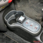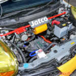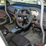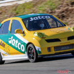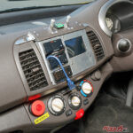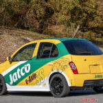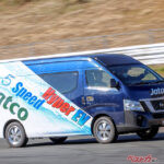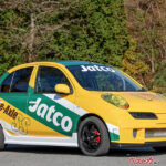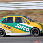 JATCOのイメージカラーであるグリーンにイエローのボディカラーが映えるEVマーチは、ツーリングカーっぽい演出が効いてカッコいい。ボンネット内とトランクの低い位置に搭載されているのは1基が60kW(82ps)レベルのモーターだ。前後輪の駆動力配分を前輪駆動寄りにセットしてスタート。