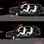 152ps/21.0kgmの2.5L直4エンジン+143ps/27.5kgmモーターのHVでフロントタイヤを駆動。リアタイヤは先代ハリアーHV同様、68ps/14.2kgmの後輪専用モーターで駆動するE-Fourを採用。システム出力は194psを発揮し、JC08モード燃費は21.8km/L