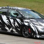 ゼブラ模様の擬装ペインティングを施してニュルを走る新型シビックタイプRのテスト車両。この段階は、新車開発ではもう最終段階といえる状況。市販開始まで1年を切っていると思われる
