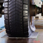 圧巻だったのが静的荷重試験。巨大プレス機のような試験機が分厚いゴムの塊のようなORタイヤのサイドウォールをしならせ、トレッド面をねじる。