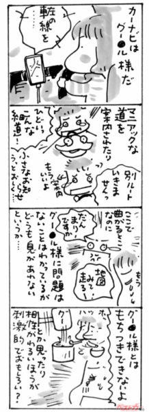 〇ーグルマップ、ときどき通す気があるのか? という細い道に誘導することがあるので困りますよね。 クルマに比べれば相性の良いバイクに乗っていた筆者はその頃からずっと愛用していますが、慣れてしまえば快適なものです。