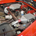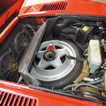 グループB車両はターボ+4WDが全盛期だったが、フェラーリはあえてミドシップの後輪駆動を選択。ベースモデルの308では横向きだったエンジンを縦に積み、オイルパンレスのドライサンプにすることで、エンジンの搭載位置を低くし旋回性を重視した前後配分の実現とメンテナンス性を向上させた。