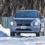 「アウトランダーはどのモードでも前後輪がしっかりと雪面を捉えて安定した姿勢で安心感が高いですね」という評価だった。]
