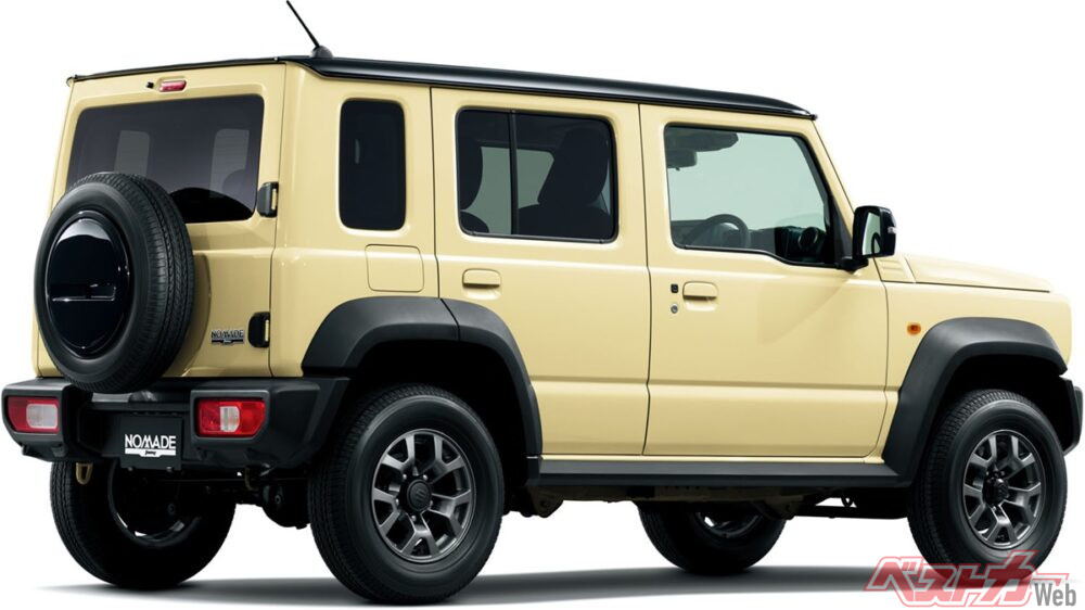 ジムニーノマドのフロントバンパーはシエラと共通の黒バンパーですが、純正アクセサリーに金属調の「フロントバンパーアンダーガーニッシュ」が用意されており、印象を大きく変えることができます。さらにサイドにも金属調の「サイドアンダーガーニッシュ」があり、純正アクセサリーでフロントとサイドをまとめるか、何もつけないかが選択の分かれ道になります。