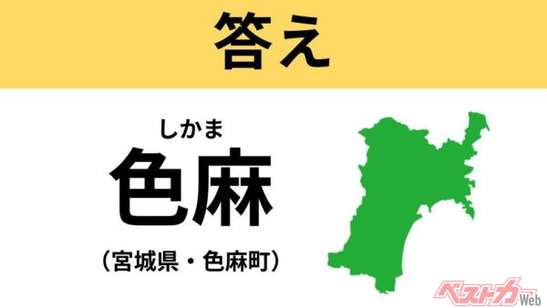 しき(色)+ま(麻)でしかま(色麻)と読むのが正解。字面はシンプルですが、初見で正しい答えを当てるのはなかなか難しいかもしれません。