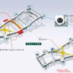 サイドレールとクロスメンバーの一部に板厚・材質の異なる鋼板をレーザー溶接で接合することで高強度、高剛性、軽量化を達成し、走行性能と安全性能も大きく向上している。