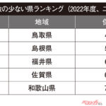 トラックやバスなども含めたすべての“自動車”の保有数の少なさは、人口の少なさとおおむね連動している。つまり人口最下位である鳥取県や2位の島根県、そして下から5番目となる福井県が上位(?)3傑を占めるのは自然の摂理に過ぎない。