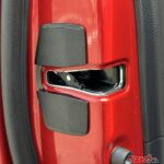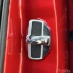 部品はドアストライカーとキャッチ部分のセットになっており、純正ドアストライカーを外して付け替えるだけ。装着すると、ドアストライカーの部分の隙間にスペーサーが入り、隙間を埋めることでステアリング操作時の車両反応を向上させる効果がある。簡単に言えば、補強パーツの一種で、価格はドアストライカー2個セットで、1万6500円(税込)だ。