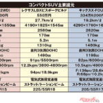 全長4mを切るフロンクス、プラットフォームをヤリスクロスと共用しながらレクサスクォリティに仕上げたLBX、そしてキックスなど、人気のコンパクトSUVをユーティリティや走りの性能、さらにはコストパフォーマンスなど、多角的な視点から解剖することにしよう。