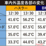 ベストカーのテストでは気温36.4度を記録した当日、正午から午後3時まで、ハスラーとBMW318iの窓を閉めてテストを実施した。車内温度は表のとおり、318iの温度がぐんぐん上がり室内温度はなんと60.8度まで上昇
