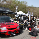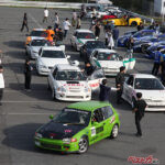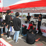 集まったのは東日本の19大学。総数は約300人で、狭いジムカーナ場のパドックは大学生と出展社で埋め尽くされました。開会式の後、早速同乗走行がスタート。パドックにつながる通路には、長い長い横乗り待ちの行列ができました。